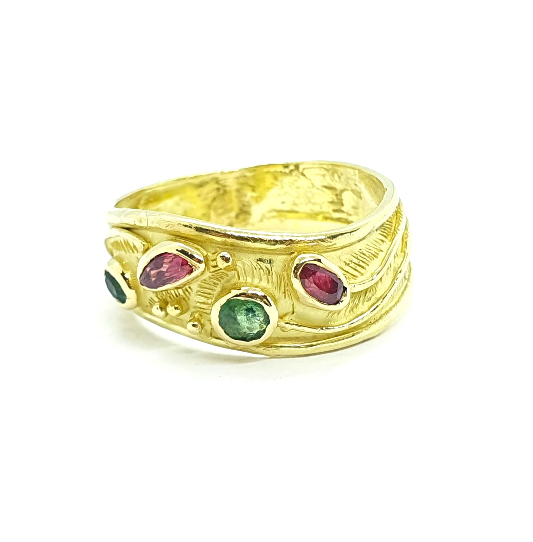 Anello a fascia con motivo a onda in oro giallo 750 con rubini e smeraldi.