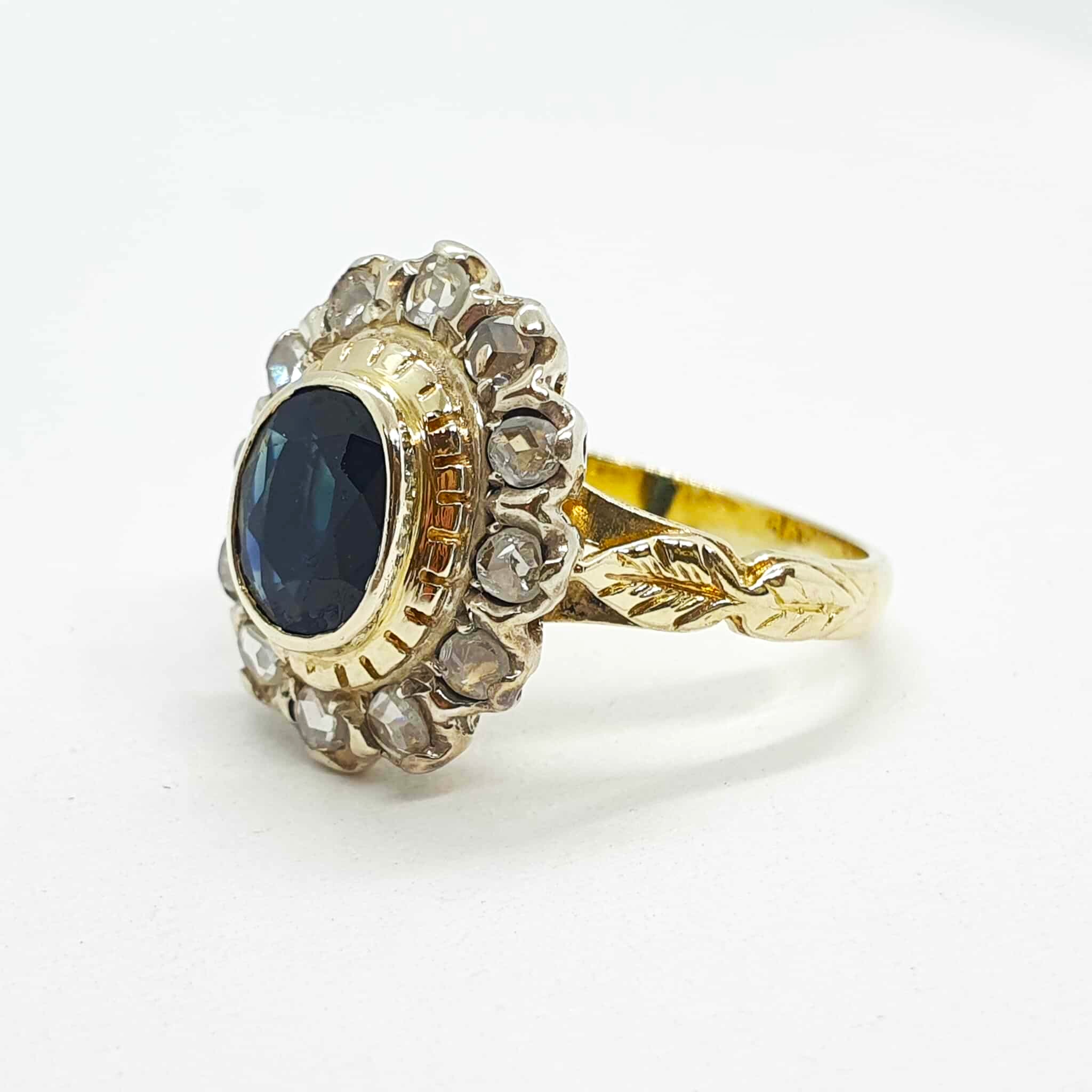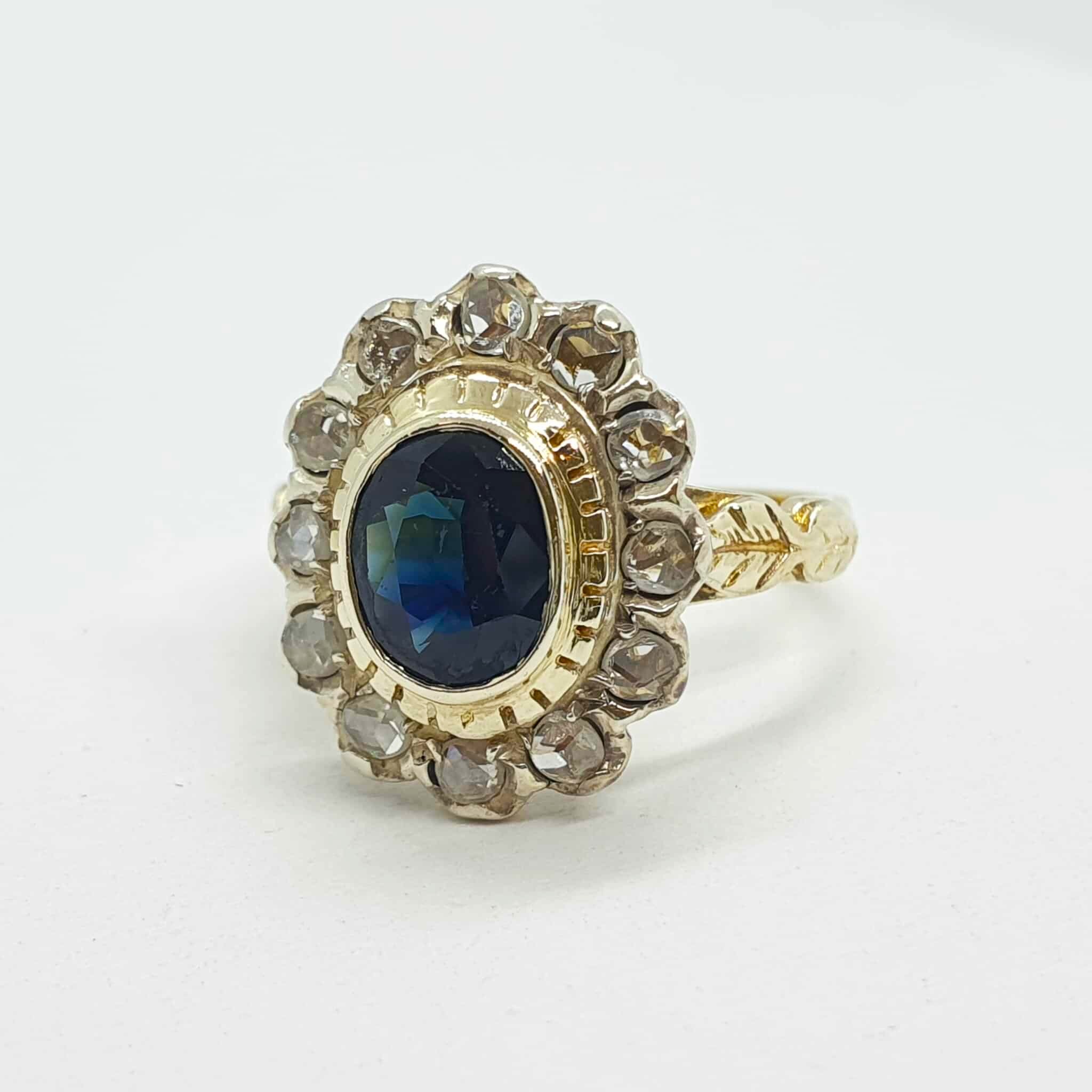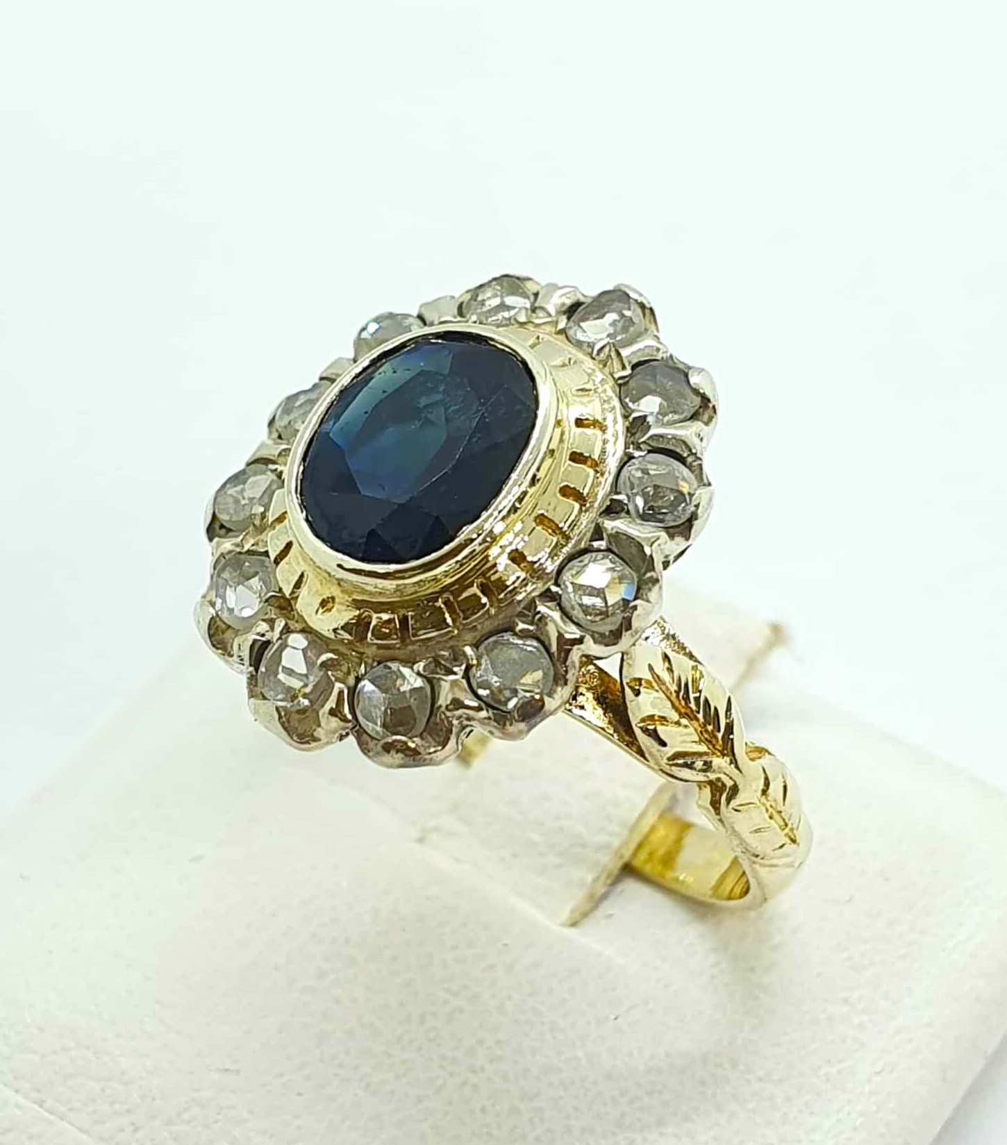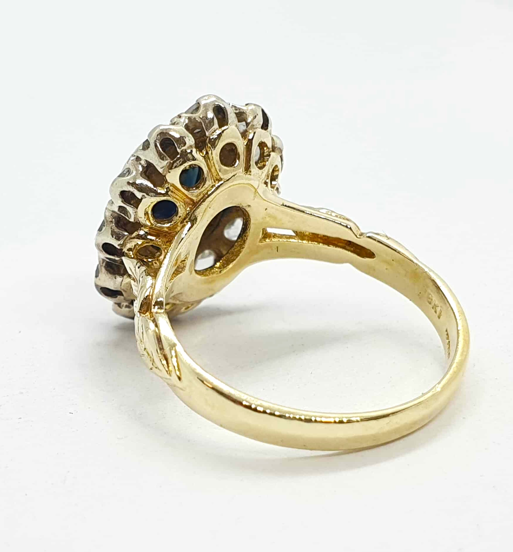 Anello vintage a margherita in oro e argento, zaffiro e diamanti