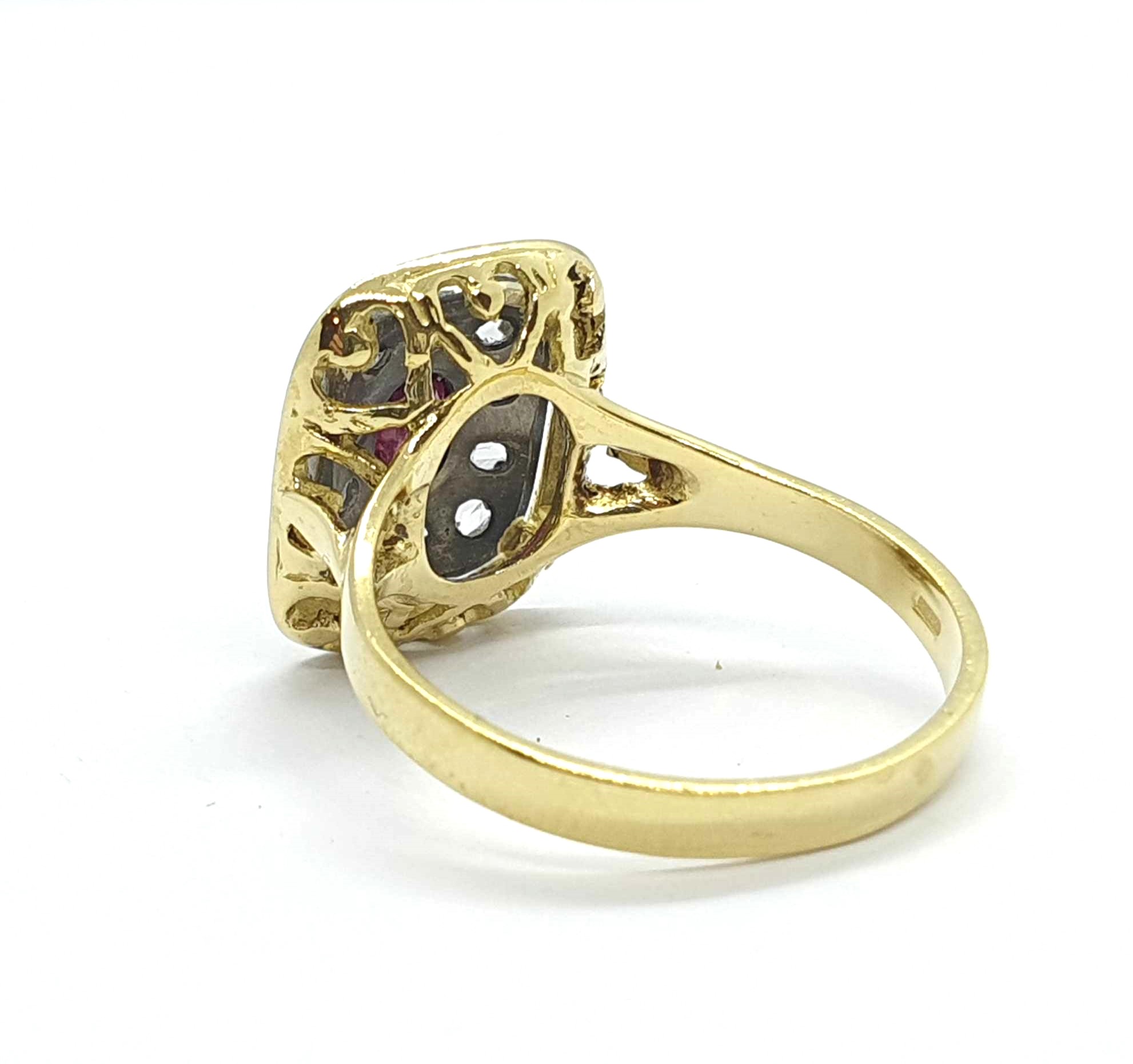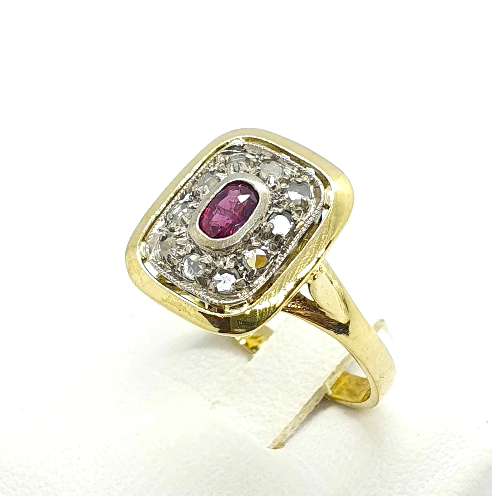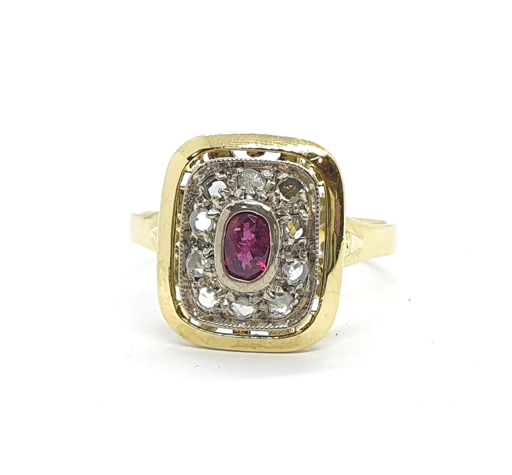 Centrale di rubino contornato dai diamanti taglio rosè.